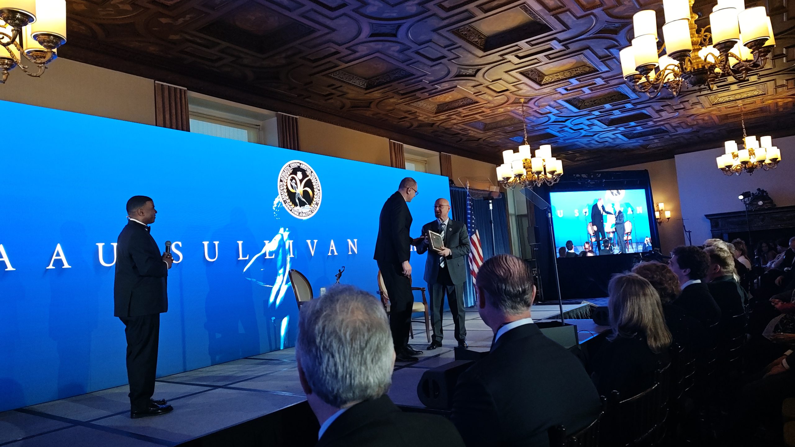 Наша делегација присуствовала је и престижној церемонији доделе традиционалних ААУ Саливан награда, у грандиозном простору НY Атлетик клуба. На самом почетку скупа, Жељко Танасковић је уручио захвалницу ИСФ председнику Америчке аматерске уније Џоу Мирзи, за изузетан допринос развоју школског спорта у Америци, што је поздрављено аплаузом. За најбољу спортисткињу на овој велелепној свечаности проглашена је пара атлетичарка Татјана Мекфаден. Скупу је присуствовала и извршна директорка ИСФ, Хасна Ајоби.